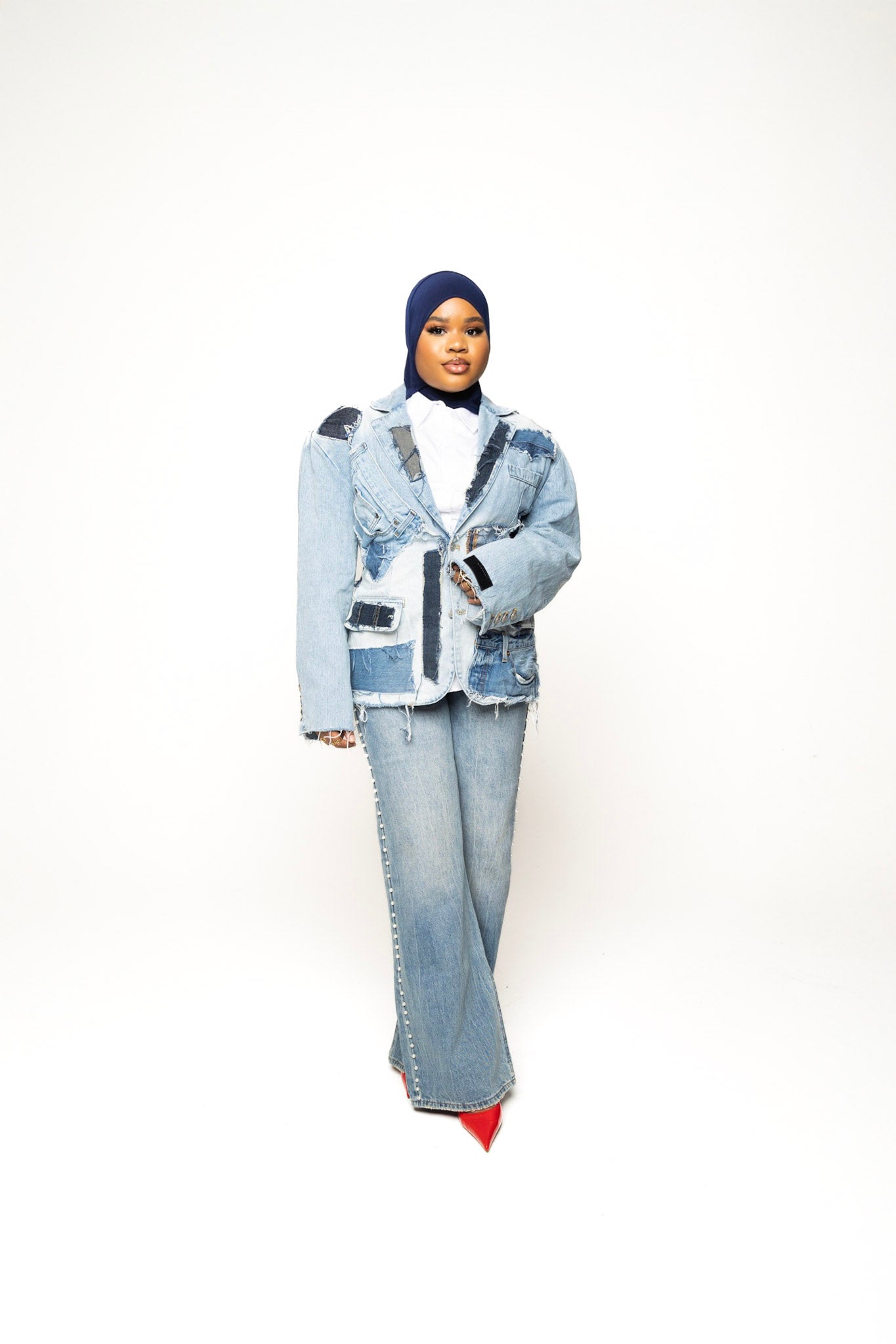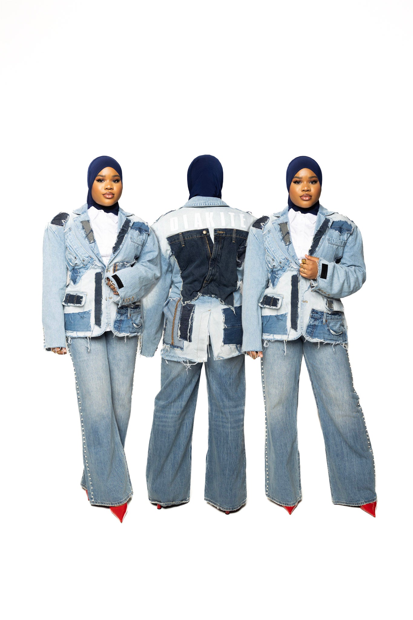 Patchwork denim blazer with DIAKITÉ detailing on the back.